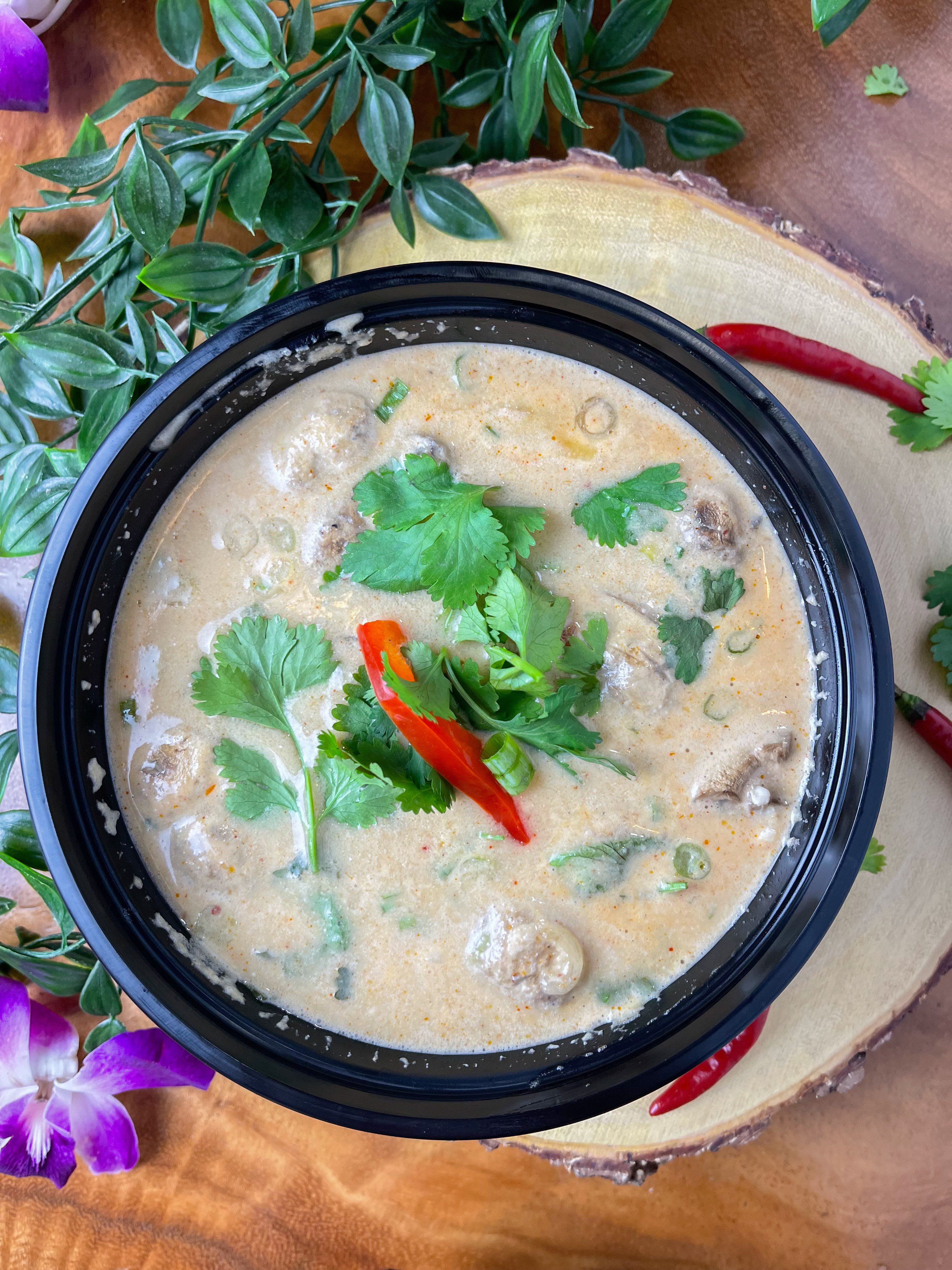 Tom Kha (Spicy) BOWLA classic Thai soup made with coconut milk, lemongrass, fresh galangal, kaffir lime leaves, and chili peppers, mushrooms, and garnished with cilantro.