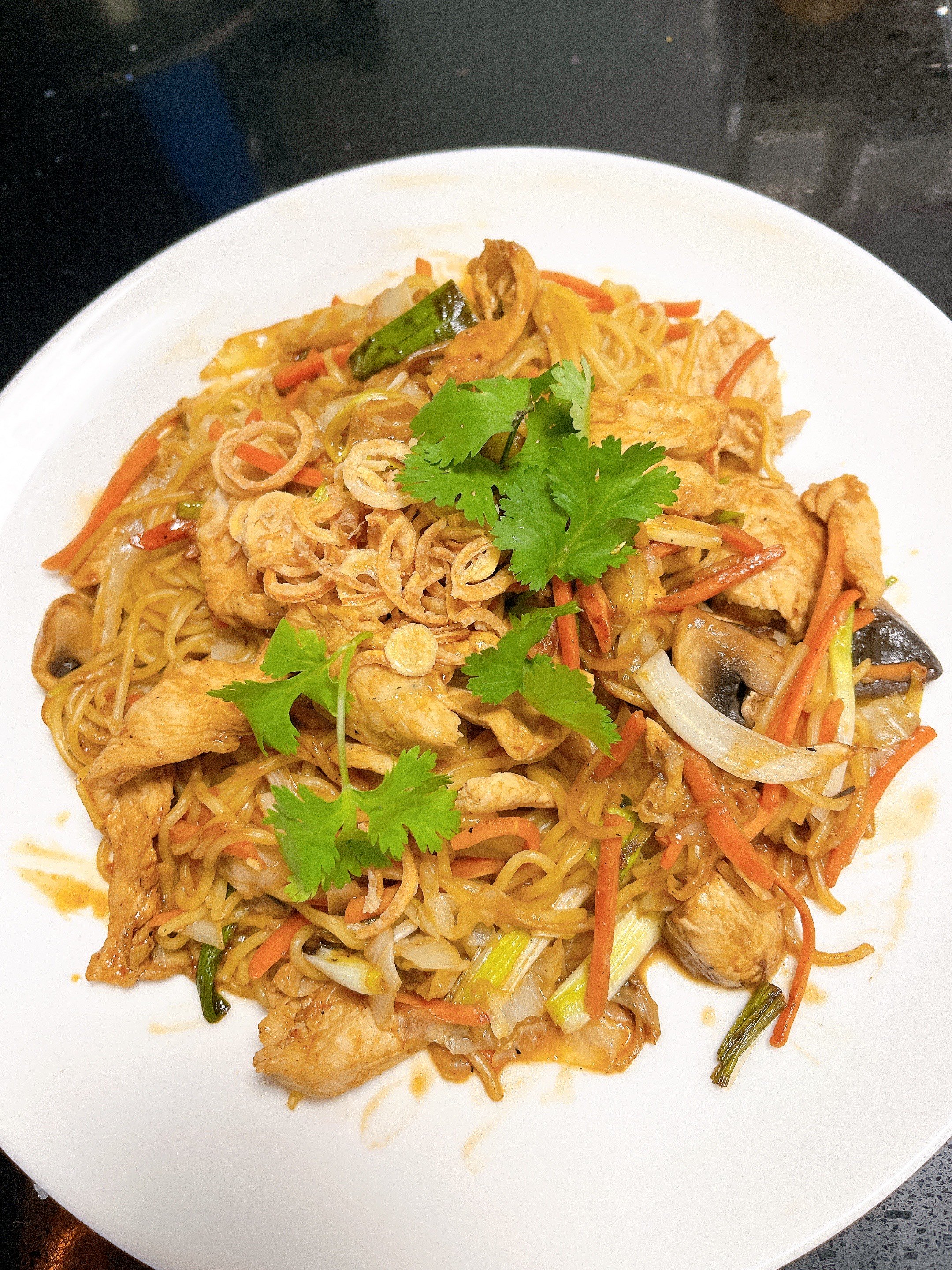 Pad Kee Mao (Drunken Noodle)Stir-fried wide rice noodles with bell peppers, onions, Thai basils, and your choice of protein with a Thai style savory sauce.